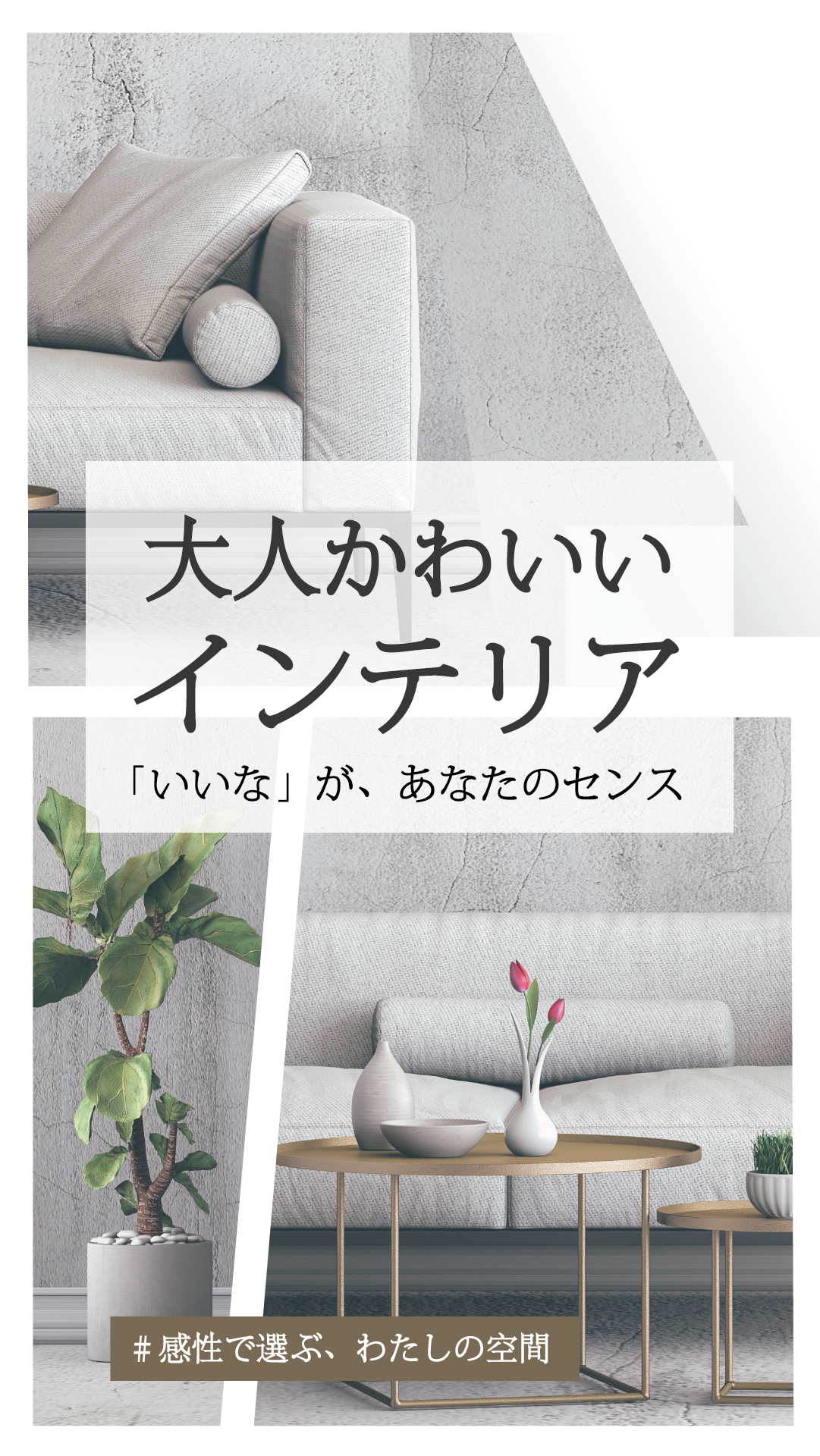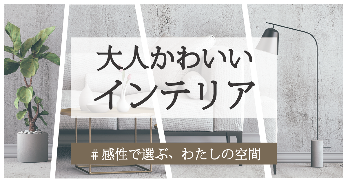 「大人かわいいインテリア」をテーマに、家具や小物の写真をコラージュのように組み合わせ、空間づくりをイメージできるように構成しました。ソファやグリーン、照明といった要素を組み合わせることで、シンプルで落ち着きのある雰囲気の中に、やわらかさと洗練を感じさせています。