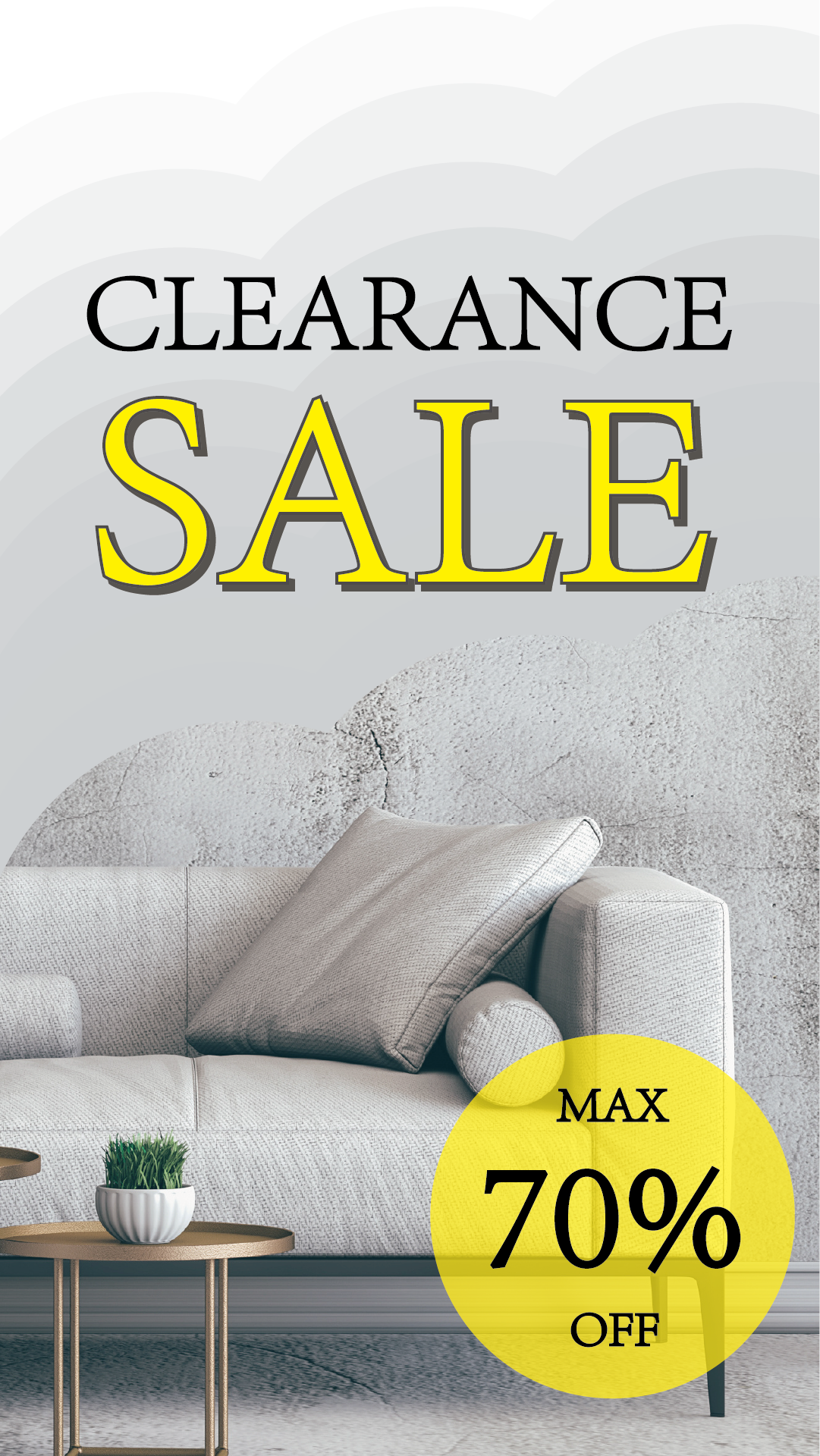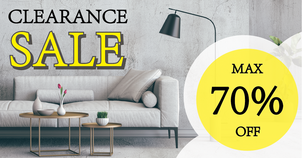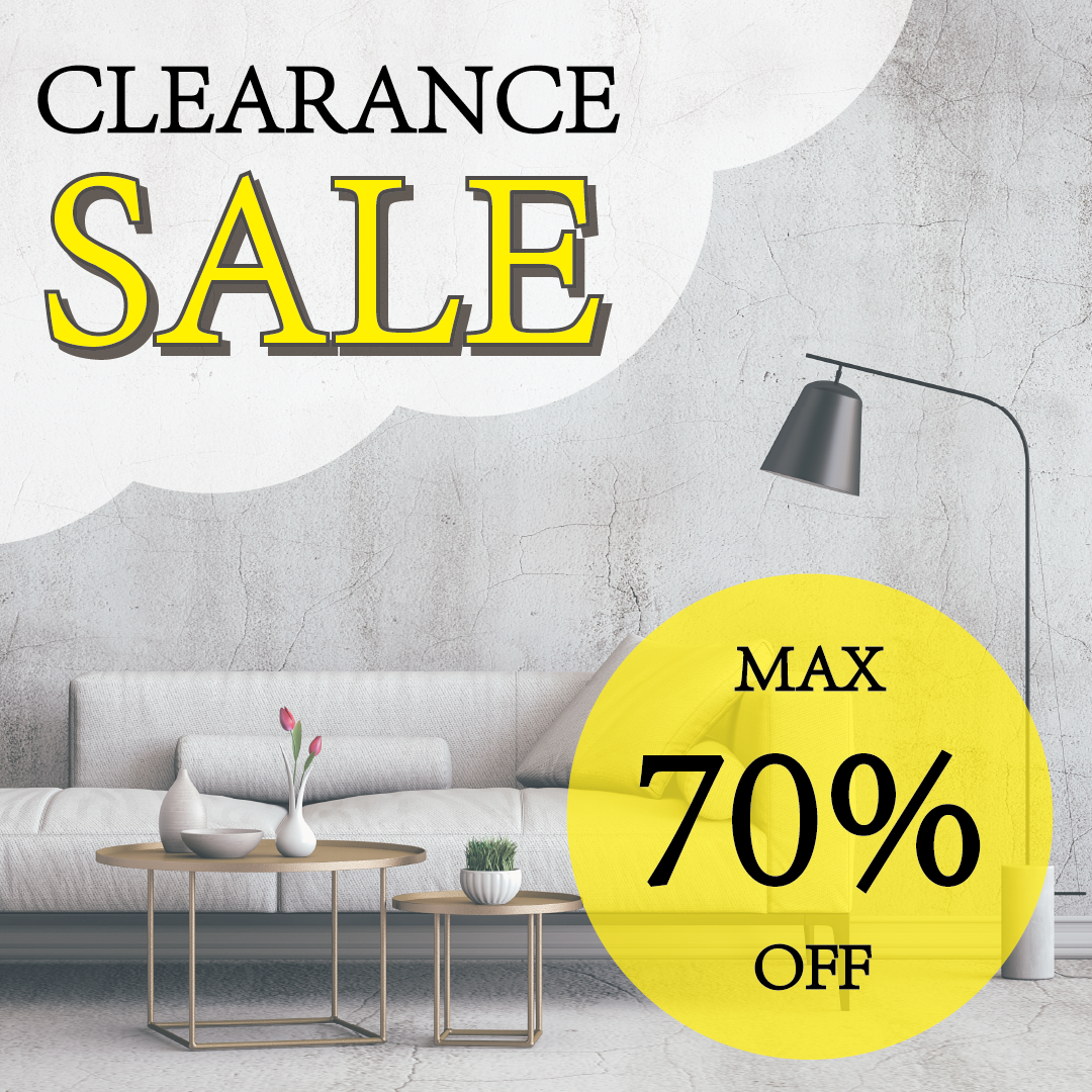 「SALE」の文字を大きく、黄色のアクセントを加えることで強いアイキャッチ効果を持たせつつ、背景にはスタイリッシュなリビング空間を配置し、インテリアの雰囲気を壊さないバランスを意識しました。